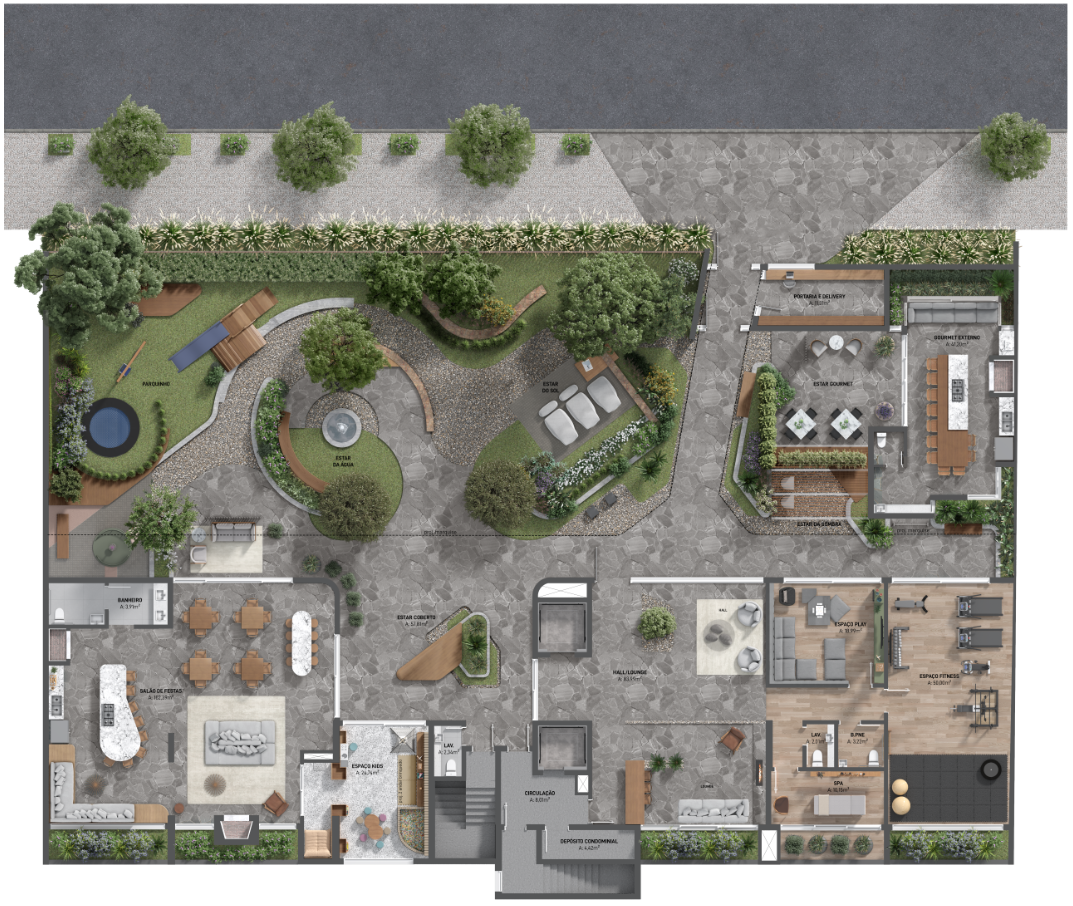 A área de lazer conta com mais de 600m2 de área de lazer a céu aberto, além de 350m2 de área de lazer coberta, oferecendo uma área de lazer completa e pensada em cada detalhe para proporcionar aos moradores comodidade, momentos de lazer, de pausa, e também de celebração.