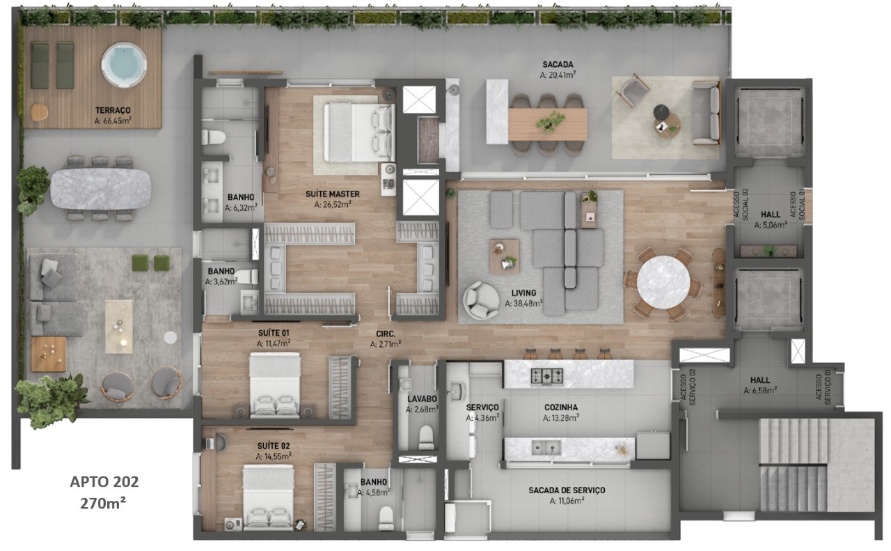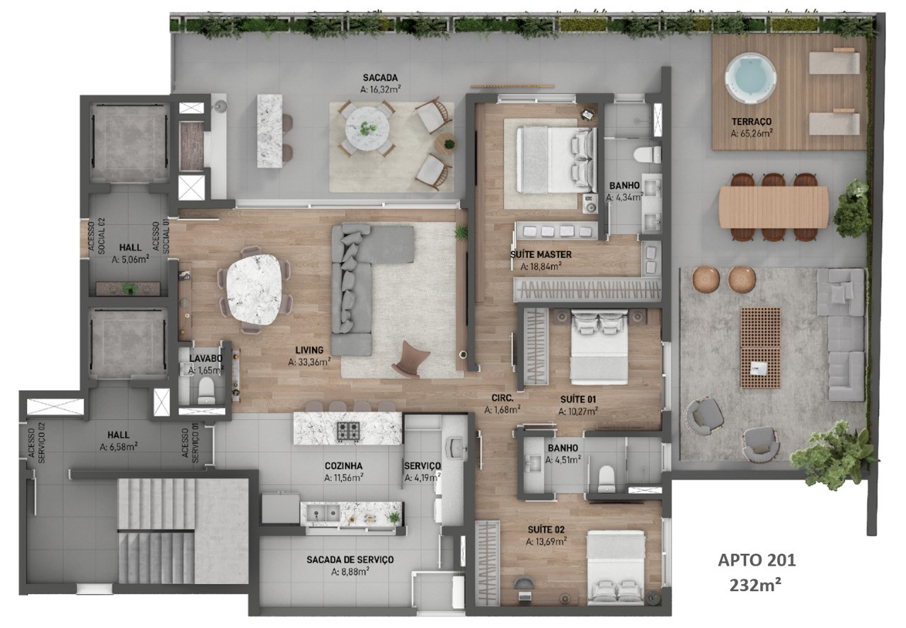 Com orientação solar NORTE, os apartamentos possuem de 156m2 a 191m2 privativos, com amplas sacadas e grandes esquadrias que possibilitam uma excelente integração entre o living e a sacada. Além disso os apartamentos contam com