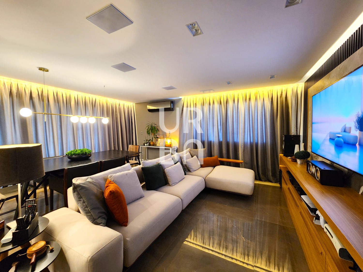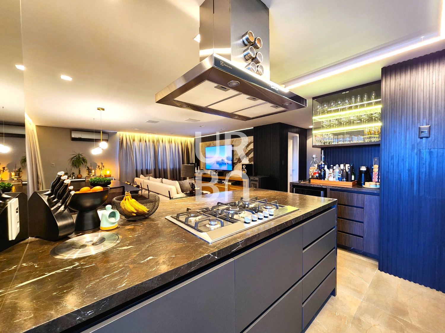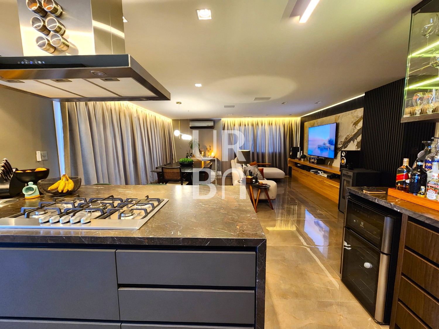 ✔️ Área Social: Amplo living com dois ambientes (estar e jantar), integrado com uma espaçosa cozinha americana, churrasqueira e uma sacada muito ampla.