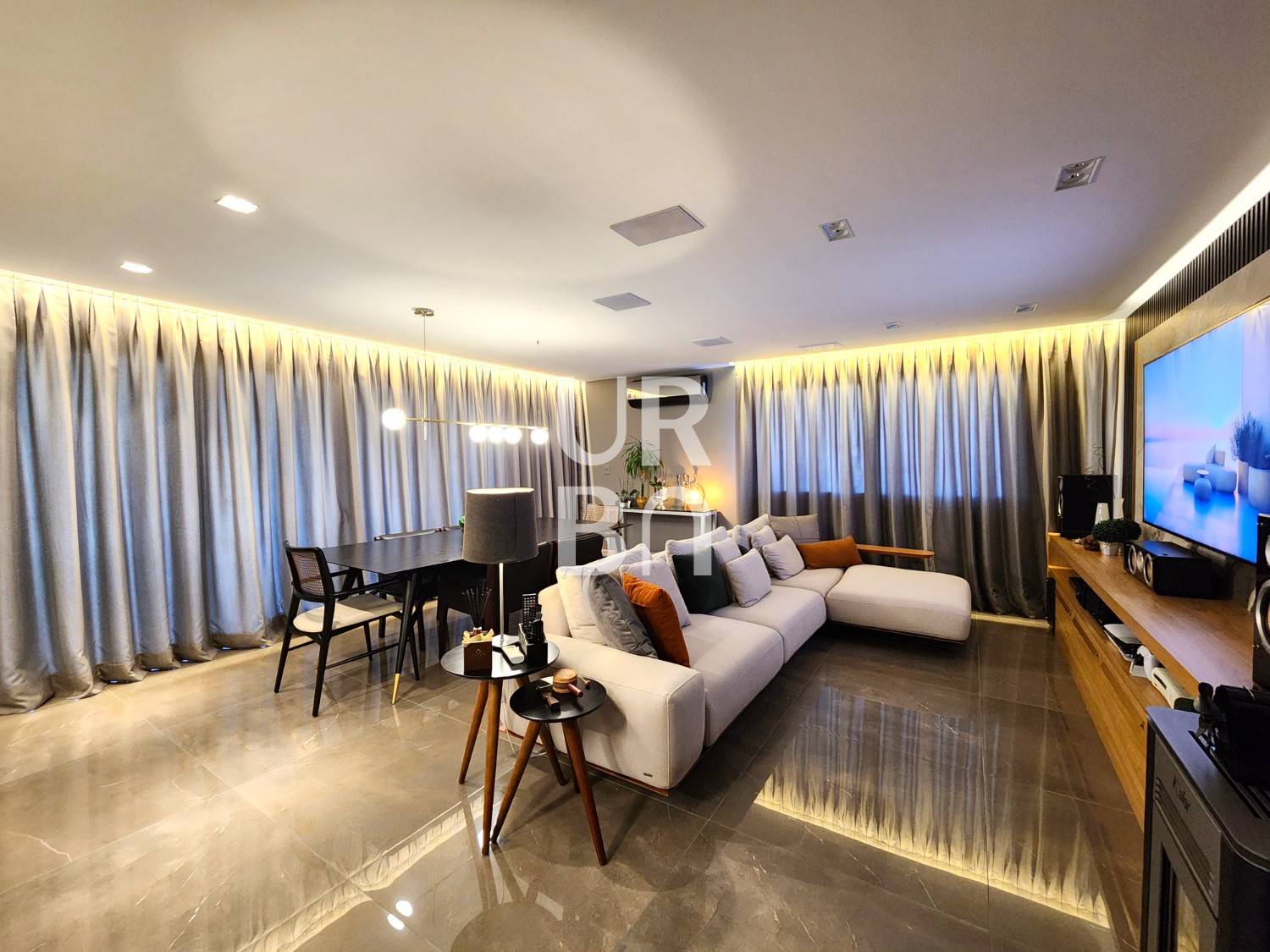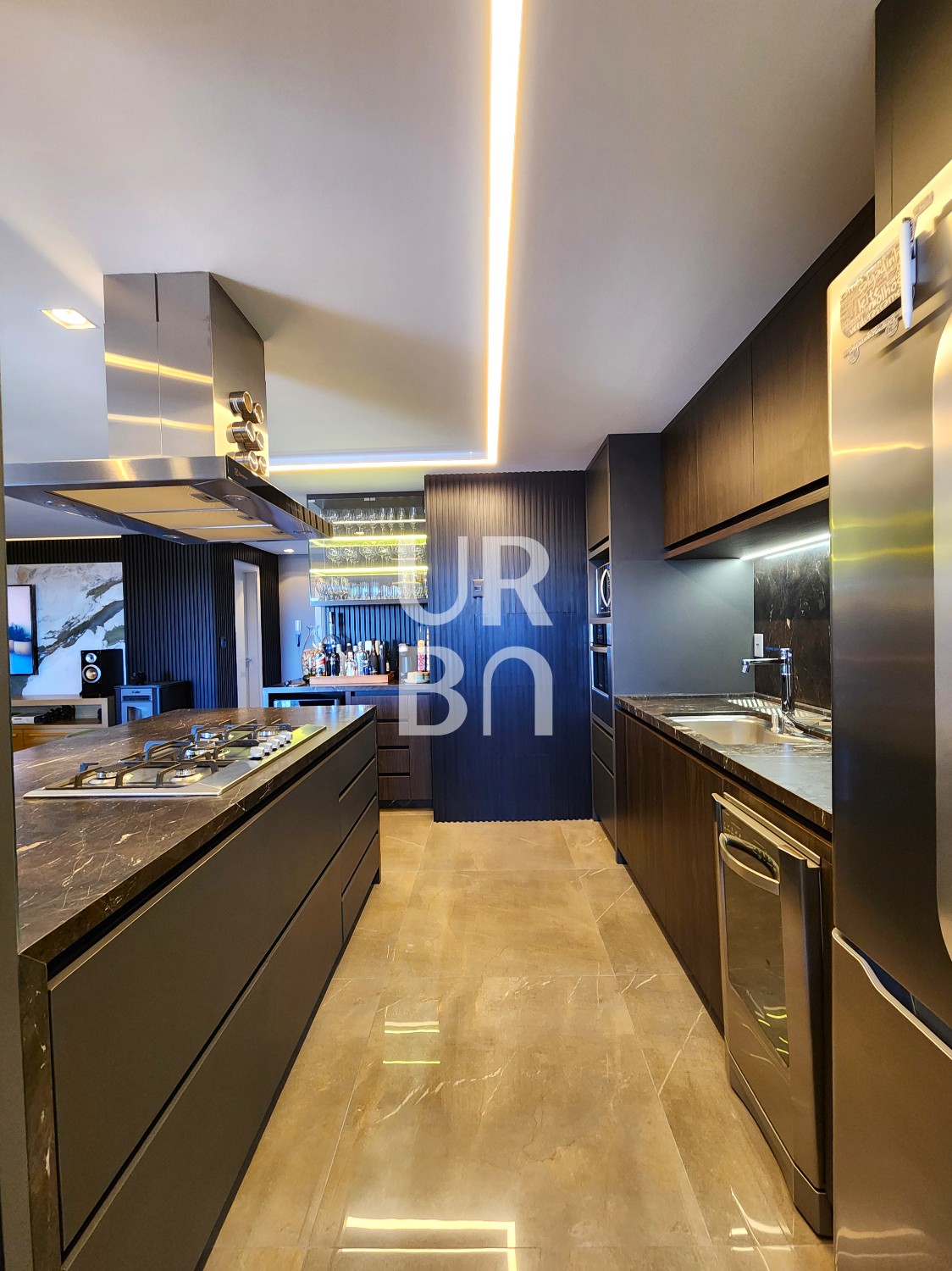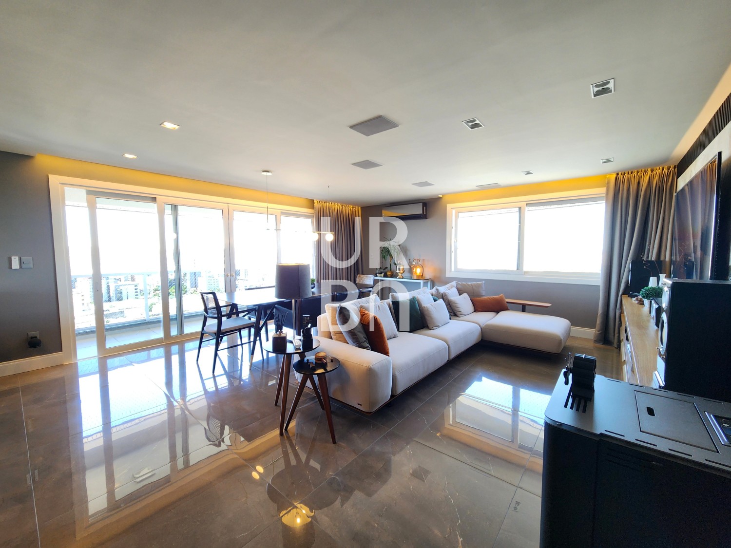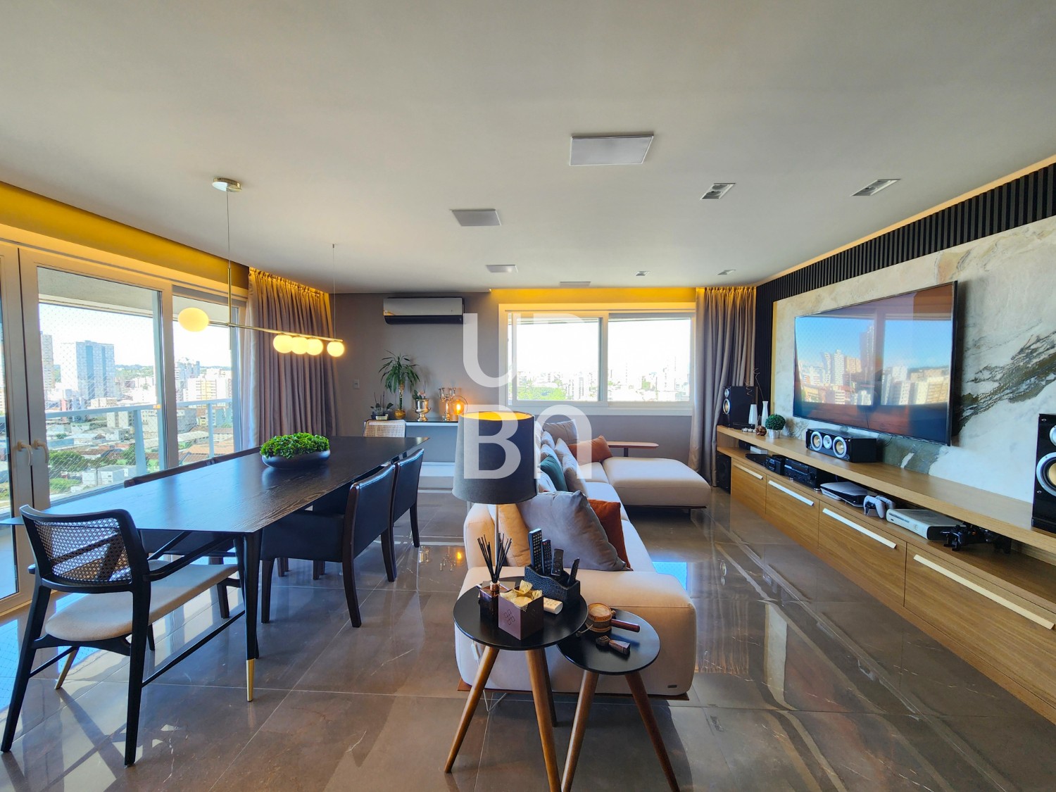 ✔️ Área Social: Amplo living com dois ambientes (estar e jantar), integrado com uma espaçosa cozinha americana, churrasqueira e uma sacada muito ampla.